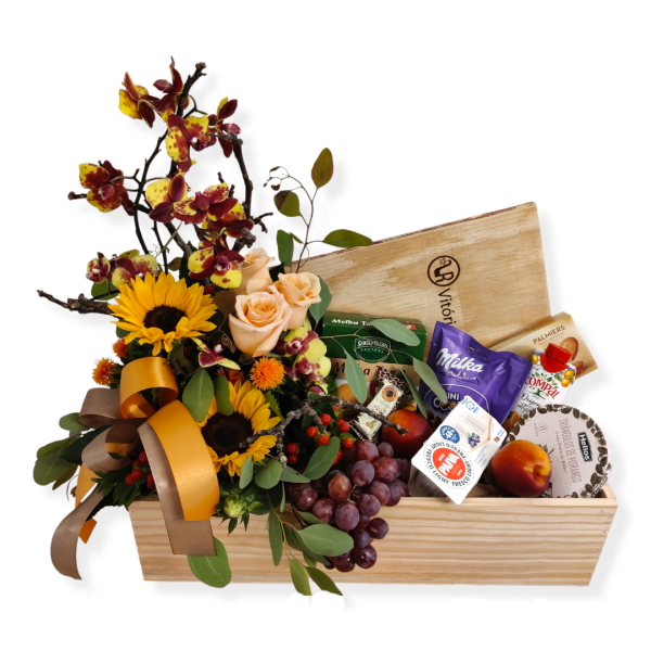 Dizem que as melhores surpresas são de manhã cedo ao acordar. Esta caixa de pequeno-almoço é um conjunto de emoções visuais e gustativas. Preparada para duas pessoas, com flores tropicais e verdes, frutas, bolachas, sumo de fruta, tostas, geleia e um laço de tecido, é algo para sempre recordar.