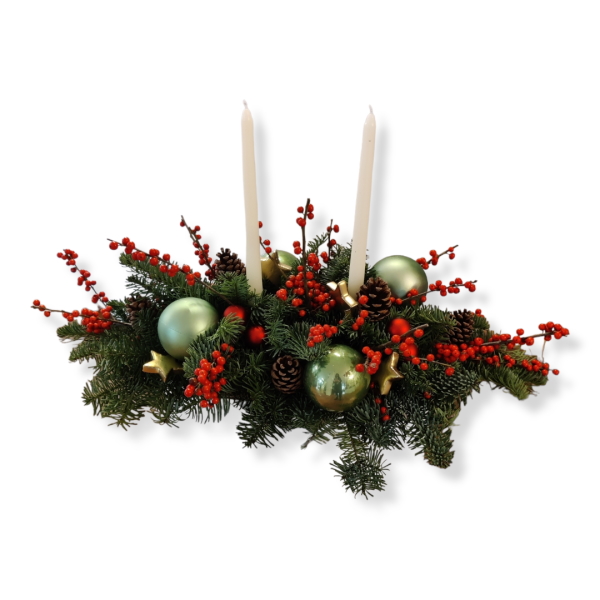 Arranjo natural para centro de mesa com ilex, abeto e enfeites natalícios, 65cm de comprimento.