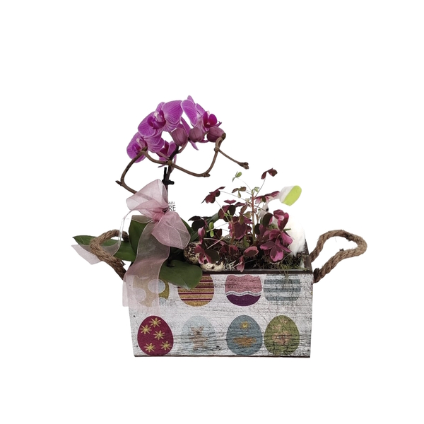 Caixinha em madeira com decoração de Páscoa e plantas verdes e com flores. O tipo e cor das plantas pode variar conforme a disponibilidade. Medidas da caixa: 19x10x9cm