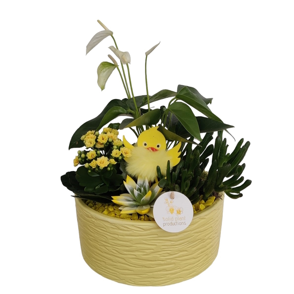 Conjunto de plantas verdes e com flores em base de cerâmica decorada para alegrar ainda mais esta época festiva da Páscoa.