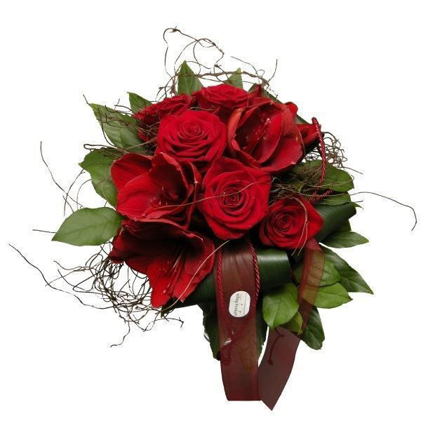 Ramo com rosas e amaryllis vermelhos, verdes variados, salix e laço.